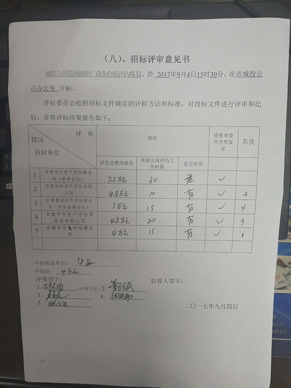 中標(biāo)候選人:安徽華亞評(píng)估事務(wù)所(中標(biāo)價(jià)格:4萬(wàn)元,承諾完成評(píng)估工作時(shí)限:15個(gè)工作日)