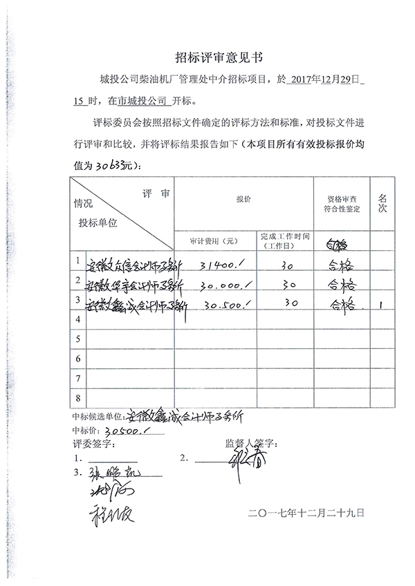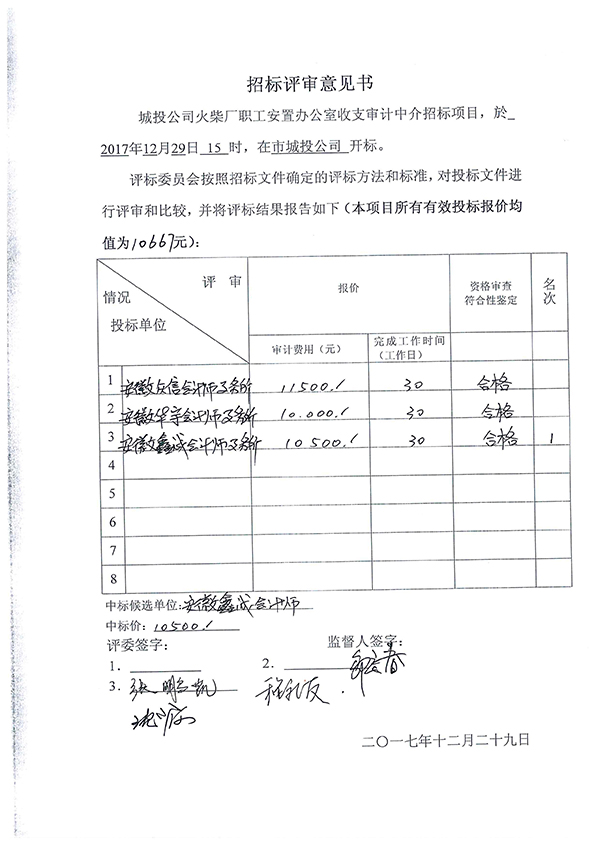 柴油機廠管理處收支審計、火柴廠職工安置辦公室收支審計中介機構招標項目中標公示 柴油機廠管理處收支審計、火柴廠職工安置辦公室收支審計中介機構招標項目中標候選單位是:安徽鑫誠會計師事務所。 打印本頁 關閉窗口