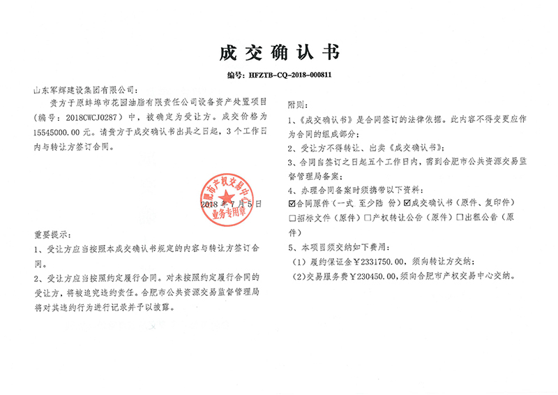我公司委托合肥市產(chǎn)權(quán)交易中心采用網(wǎng)絡(luò)競(jìng)價(jià)的方式對(duì)原蚌埠市花園油脂有限責(zé)任公司設(shè)備資產(chǎn)進(jìn)行公開處置。2018年6月21日發(fā)布公告,2018年7月5日確定了受讓方,2018年7月9日簽訂了《成交確認(rèn)書》?,F(xiàn)將具體情況公告如下: