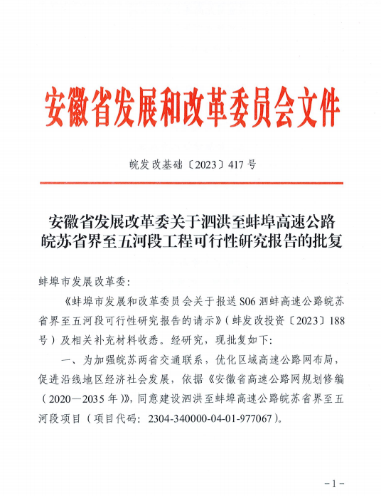 2023年8月24日,S06泗蚌高速公路皖蘇省界至五河段項(xiàng)目工程可行性研究報(bào)告獲省發(fā)改委批復(fù),標(biāo)志著泗蚌高速公路建設(shè)取得實(shí)質(zhì)性突破。